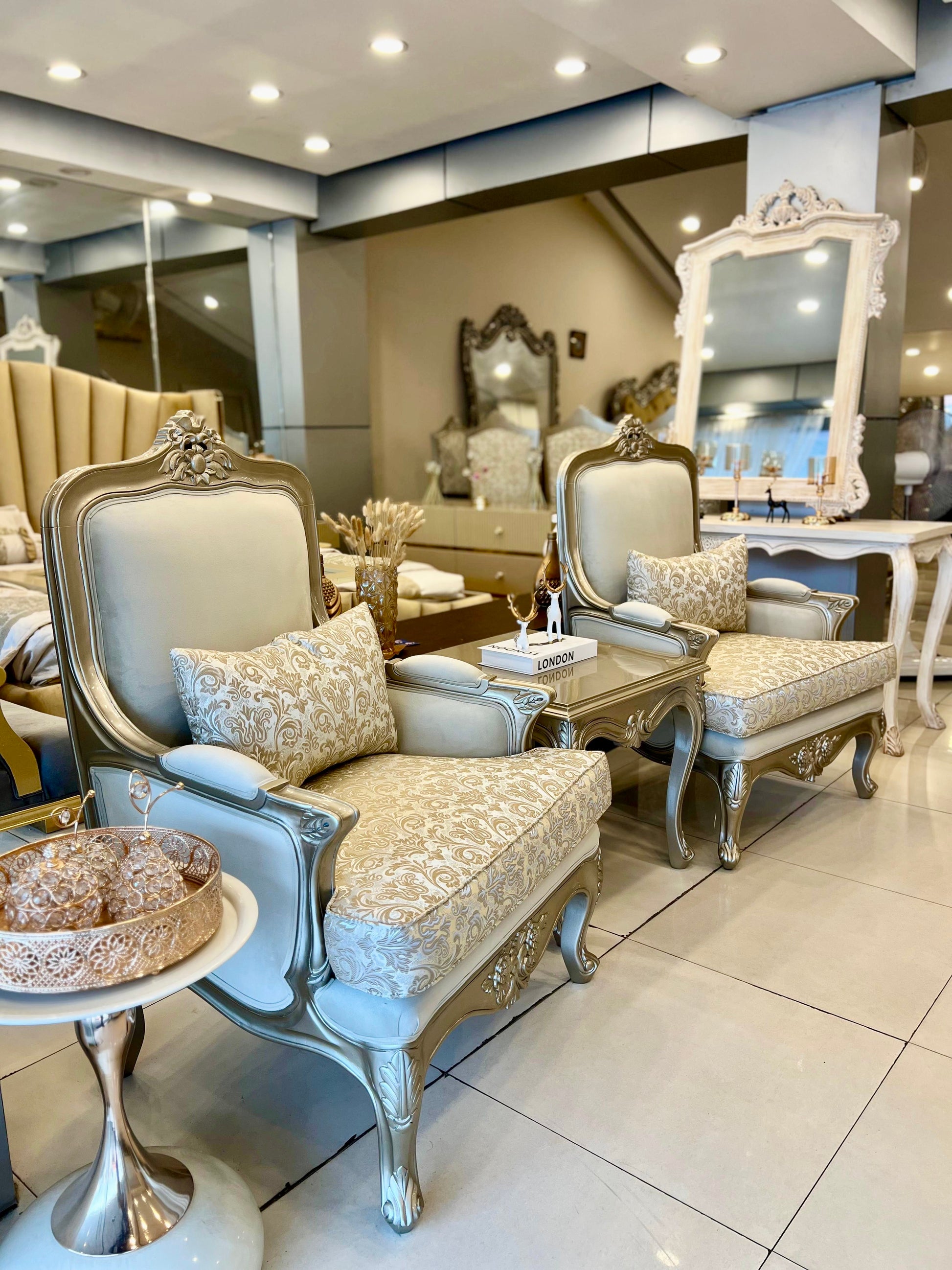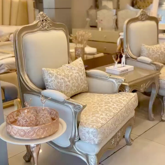 These chairs are a masterpiece of classic elegance, featuring foliage embroidered seats and cushions that bring a touch of natural charm to the design. The frame is finished in a soft ivory beige tone, enriched with a carved wood top motif that showcases fine craftsmanship. Beautifully carved arms and legs add to the regal character, making each chair not only a seat but a statement of luxury. Perfect for refined living spaces, they blend comfort, artistry, and timeless sophistication in one design.