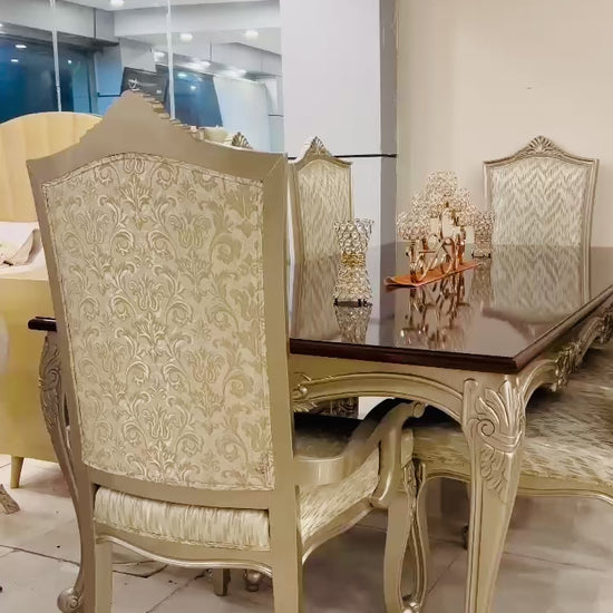 This magnificent dining set embodies timeless sophistication with its rich wooden tabletop and intricately carved antique champagne-gold frame. The table rests on elegantly curved legs adorned with baroque-inspired carvings, adding a royal touch to its design. The high-back chairs are upholstered in luxurious damask and patterned fabrics, combining comfort with regal beauty. Their tall, graceful silhouettes and detailed trims perfectly complement the table’s grandeur. Ideal for formal dining spaces, this set creates an atmosphere of refinement and luxury, making every meal feel like a royal feast.